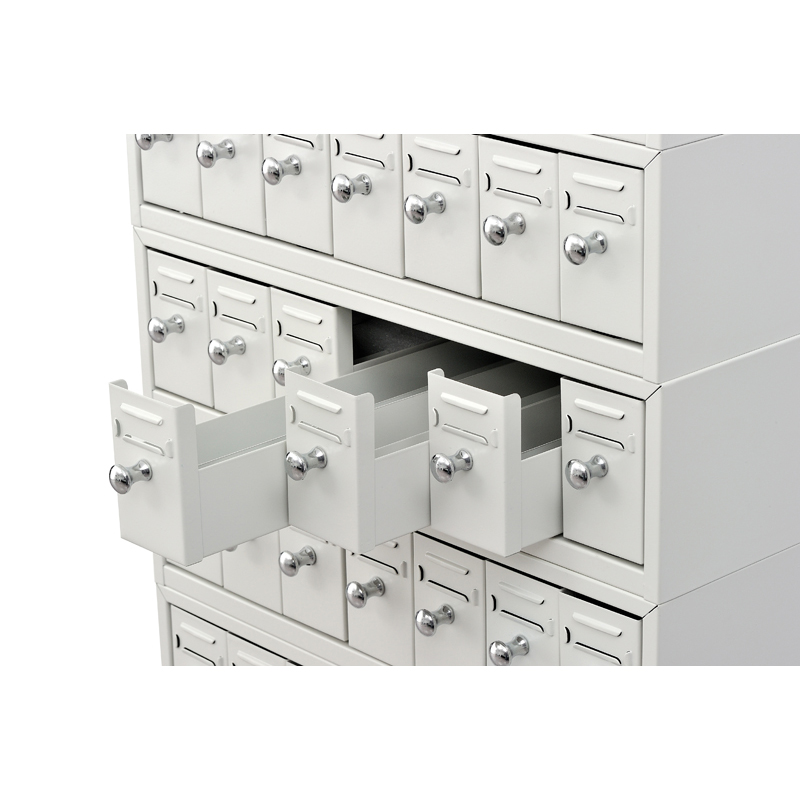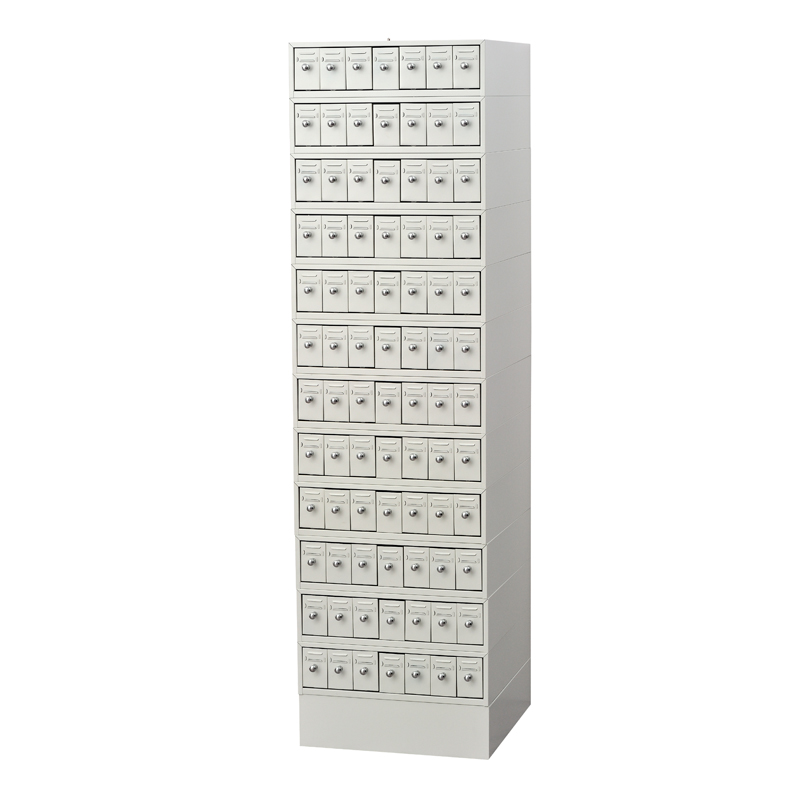 底座采用宝钢SPCC1.2冷轧钢板,箱体0.8冷轧钢板,抽屉0.8冷轧钢板,八十四个抽(十二节,每节七抽,加一底座,每只抽屉可存放标准玻璃切片900张,每组存放切片75600张以上),玻片专用抽进口ABS滑道抽屉内置暗锁,防滑功能.拉手采用ABS镀铬,抽屉内分隔六个空间,便于存档。柜体表面处理脱脂除油、表调、锌系磷化、钝化、粉末喷涂。